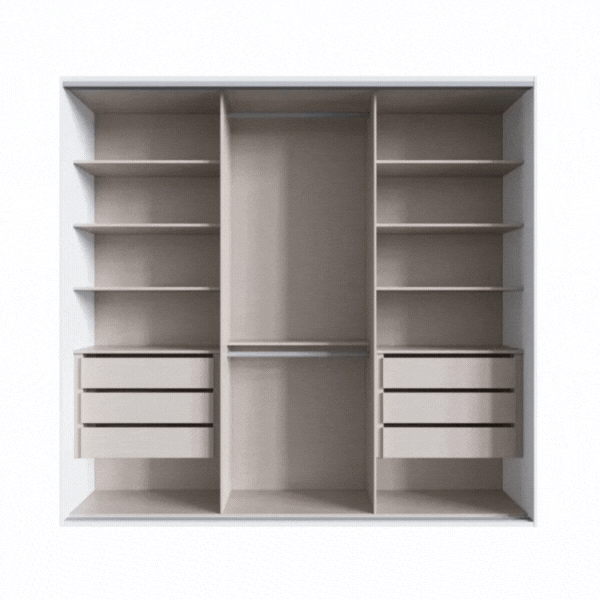 O guarda-roupa Rudnick oferece um layout interno versátil, pensado para deixar o seu dia a dia mais prático e funcional. Durante a montagem, você pode definir a divisão interna, escolhendo a disposição de prateleiras, cabideiros e gavetas que melhor se adapta às suas necessidades de uso e organização.