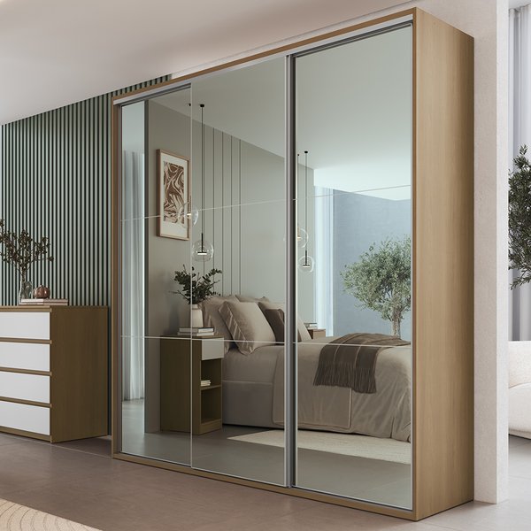 Praticidade para o dia a dia. O Guarda-Roupa espelhado Rudnick transforma o espaço com sofisticação. O espelho em todas as portas amplia o ambiente e valoriza a luminosidade natural.