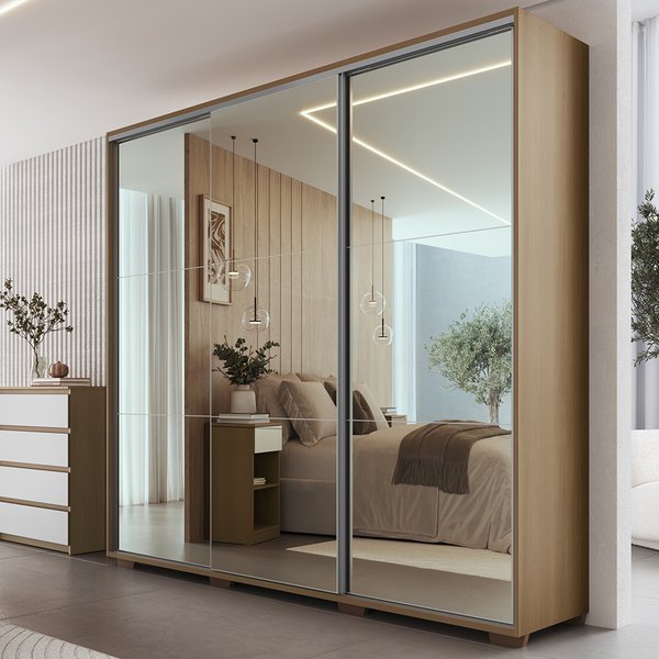 Praticidade para o dia a dia. O Guarda-Roupa espelhado Rudnick transforma o espaço com sofisticação. O espelho em todas as portas amplia o ambiente e valoriza a luminosidade natural.