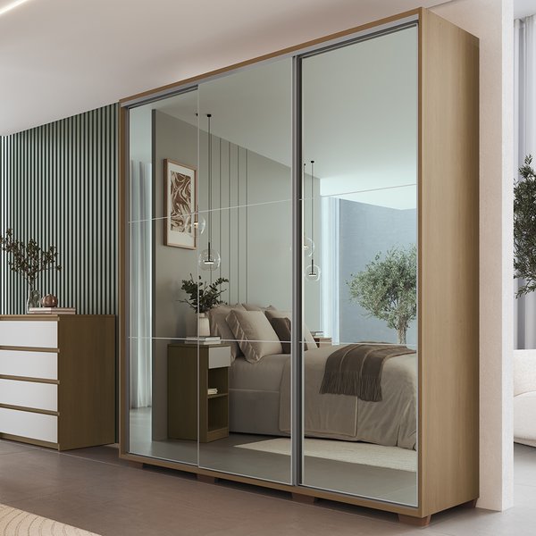 Praticidade para o dia a dia. O Guarda-Roupa espelhado Rudnick transforma o espaço com sofisticação. O espelho em todas as portas amplia o ambiente e valoriza a luminosidade natural.