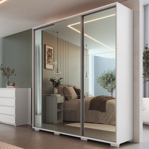 Praticidade para o dia a dia. O Guarda-Roupa espelhado Rudnick transforma o espaço com sofisticação. O espelho em todas as portas amplia o ambiente e valoriza a luminosidade natural.