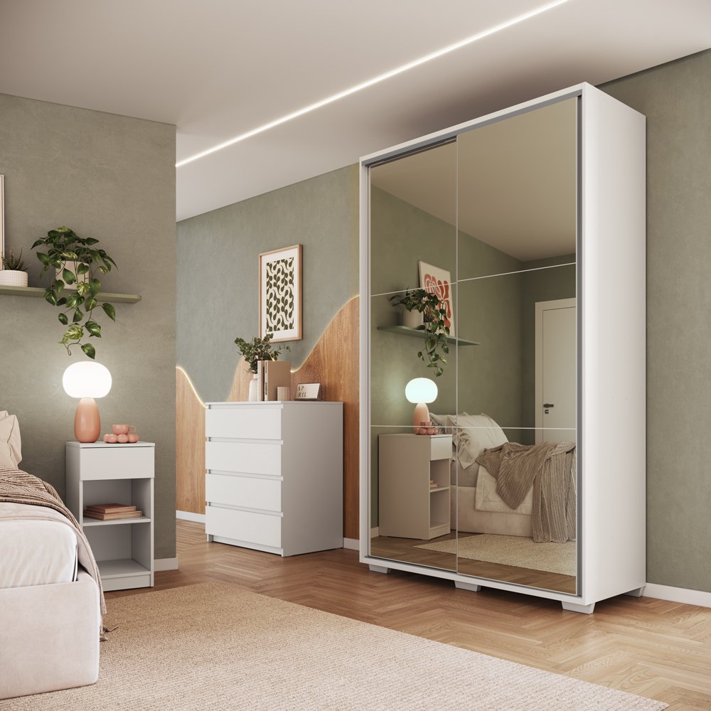 Praticidade para o dia a dia. O Guarda-Roupa espelhado Rudnick transforma o espaço com sofisticação. O espelho em todas as portas amplia o ambiente e valoriza a luminosidade natural.