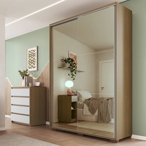 Praticidade para o dia a dia. O Guarda-Roupa espelhado Rudnick transforma o espaço com sofisticação. O espelho em todas as portas amplia o ambiente e valoriza a luminosidade natural.
